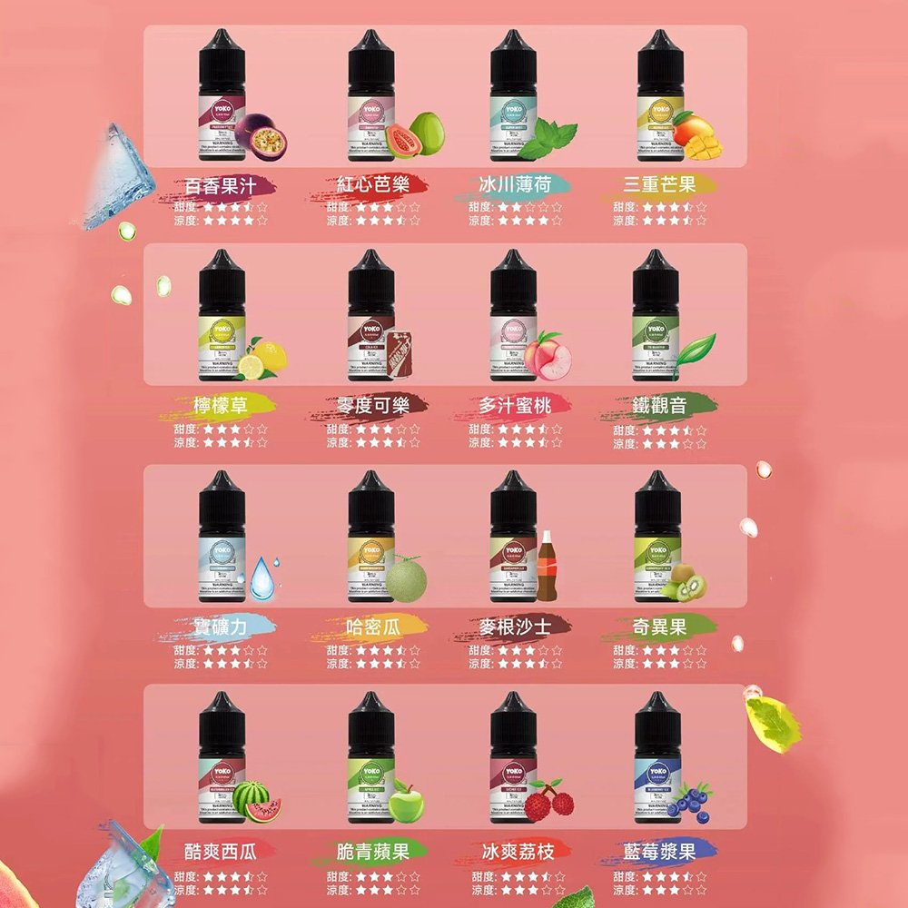第一次下單的客戶下單后請主動添加客服LINE 提供訂單編碼或都姓名確認訂單 下單后包裹約2-3天左右到達門市 口味涼度跟甜度表 多肉葡萄 涼度:★★★★☆ 甜度:★★★☆☆ 百香果 涼度:★★★★☆ 甜度:★★★☆☆ 紅心芭樂 涼度:★★★★☆ 甜度:★★★☆☆ 冰川薄荷 涼度:★★★★☆ 甜度:★★☆☆☆ 三重芒果 涼度:★★★★☆ 甜度:★★★☆☆ 檸檬草 涼度:★★★★☆ 甜度:★★★☆☆ 零度可樂 涼度:★★★★☆ 甜度:★★★☆☆ 多汁蜜桃 涼度:★★★★☆ 甜度:★★★★☆ 鐵觀音 涼度:★★★★☆ 甜度:★★★☆☆ 寶礦力 涼度:★★★★☆ 甜度:★★★☆☆ 哈密瓜 涼度:★★★★☆ 甜度:★★★★☆ 麥根沙士 涼度:★★★★☆ 甜度:★★★☆☆ 奇異果 涼度:★★★☆☆ 甜度:★★★☆☆ 酷爽西瓜 涼度:★★★★☆ 甜度:★★★★☆ 脆青蘋果 涼度:★★★☆☆ 甜度:★★★☆☆ 冰爽荔枝 涼度:★★★☆☆ 甜度:★★★★☆ 藍莓漿果 涼度:★★★☆☆ 甜度:★★★★☆ 產品規格 容量與濃度:常見規格為 30ml 容量, 尼古丁濃度為 35mg,適合有快速解癮需求的使用者。![]()